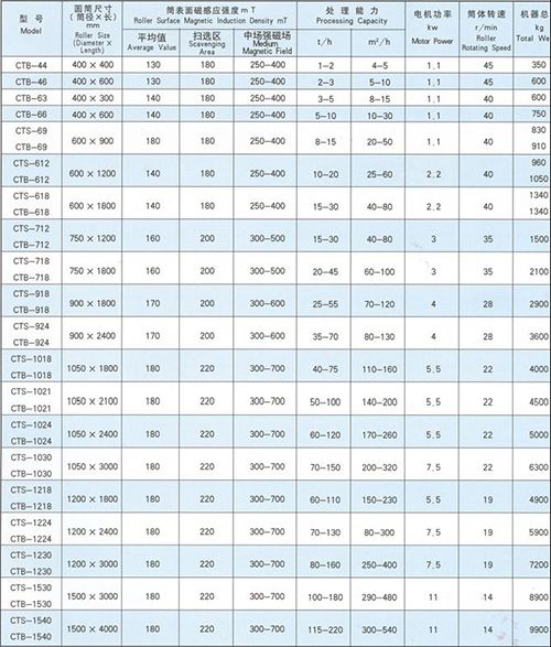CTB系列永磁筒式磁選機磁場分旋轉式、固定式兩種機構,固定式主要適用于弱磁場濕式選別細顆粒的強磁性物質,或者除去非磁性礦物中的強磁性礦物,當漿流入磁場區時,其中強磁性礦物被吸附在圓筒表面,弱磁性和非磁性礦物被分選后排除,而吸附在圓筒表面的強磁性礦物隨圓筒的旋轉被帶出磁場區。旋轉式適用于細粒強(中強)磁性礦物的干選,由于高速旋轉的作用,使磁性顆粒的磁滾翻次數大大高于普通磁選機,這對于破環磁團聚,提高富礦比具有顯著的效果,礦物經分選后被分離成磁性物和非磁性物兩種,分別從各自的排礦口排出該機,適用于礦石粒度為0.6-6mm的粗選和精選。 同一圓筒可配三種槽體,即順流槽(CTS)選別粒度≤6mm,逆流糟(CTN)選別粒度≤0.6mm,半逆流槽(CTB)選別粒度≤1mm。